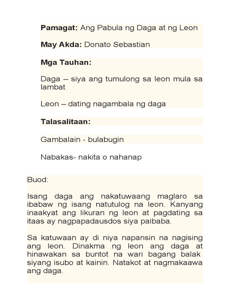 Isang umaga nagising ang leon dahil may isang maliit na daga na tumakbo sa kanyang katawan. FfAng Pabula ng Daga at ng Leon by KatigCom From KatigComs book of fables. Sino ang tinaguriang Ama ng Maikling Kwento sa Pilipinas.